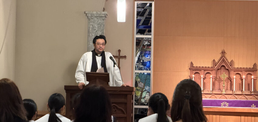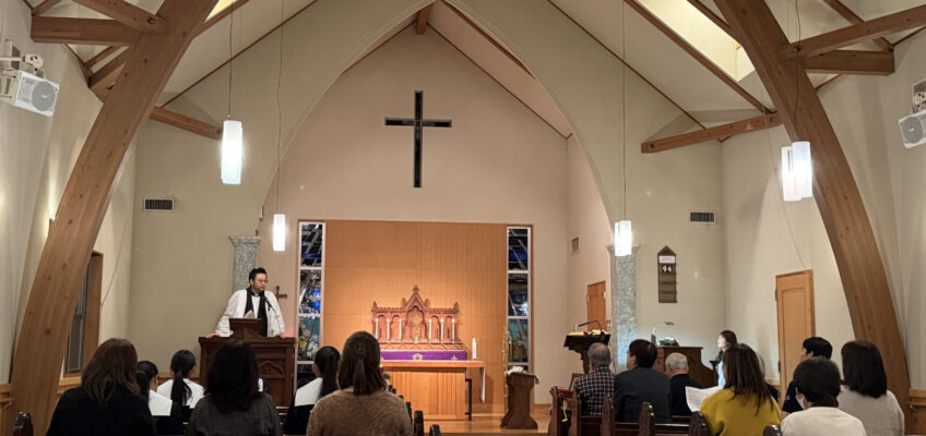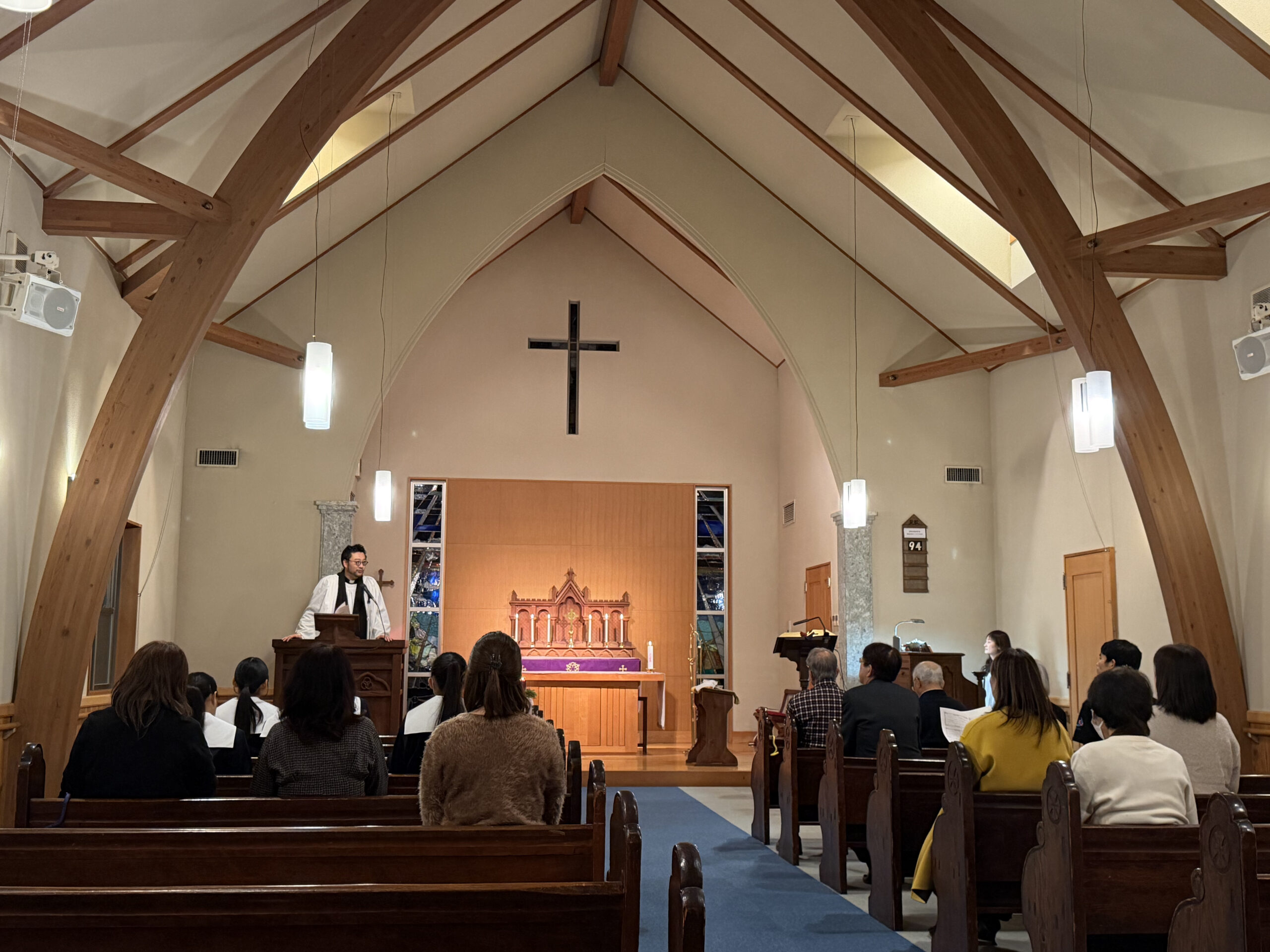 礼拝は窪田真人司祭(神学部・2007卒)の司式のもと執り行われ、蝋燭の灯りと祈りの言葉に包まれながら、クリスマスの意味に立ち返る時間となりました。