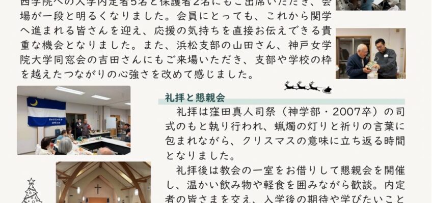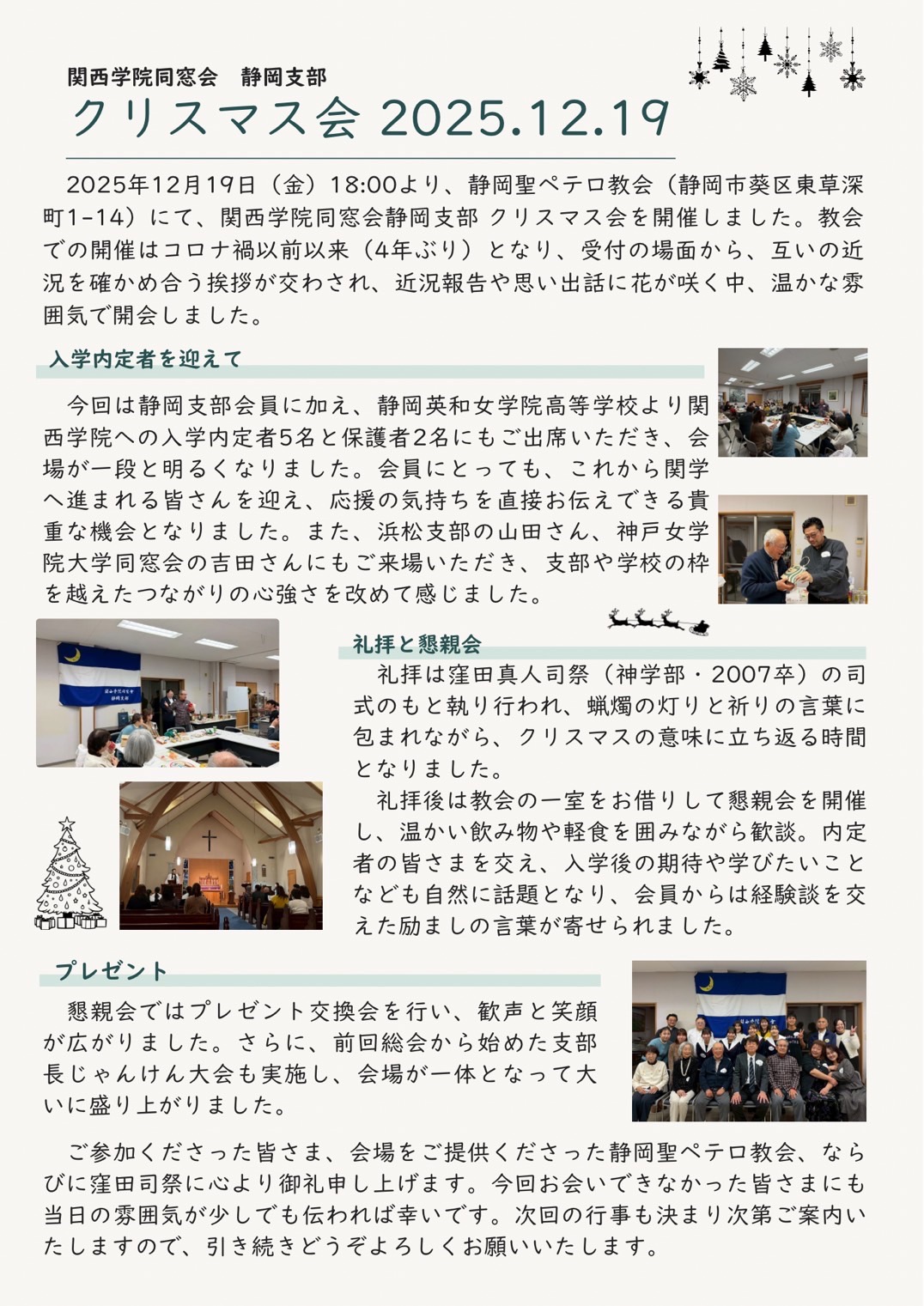 2025年12月19日(金) 18:00より、静岡聖ペテロ教会にて、関西学院同窓会静岡支部クリスマス会を開催しました。